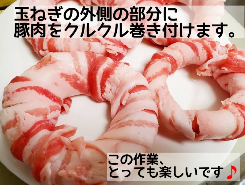 - @玉ねぎを1cm幅に輪切りにし、内側をくり抜いてリング状にし(4個作る)、豚バラ肉をクルクル巻き付ける。
