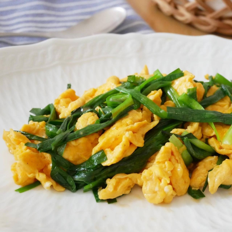A卵を溶きほぐし、牛乳、塩こしょうを 入れる。 Bごま油をひいたフライパンで卵を炒めて 一旦取り出す。 Cニラをごま油で炒め、Bを入れ、 ☆で味をつけて完成。