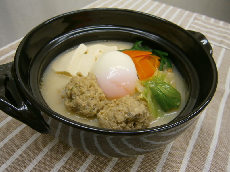 - ・豆乳 200g ・水300g ・豚肉 70g ・玉ねぎ 4分の1 ・人参 適量 ・キャベツ 適量 ・温泉たまご 1個 ・ねぎ 少々 ・みそ 大1 ・しょう油 大1 ・みりん 大1 ・鶏がらスープの素 大1 ・和風だし 少々