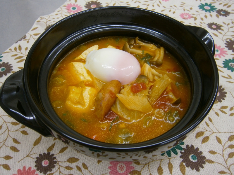 ・トマトホール 2分の1 ・水 600cc ・ブロッコリー 2分の1 ・ウインナー 1袋 ・玉ねぎ 2分の1 ・チンゲン菜 1株 ・とろけるチーズ 4枚 ・温泉たまご 2個 ・コンソメ顆粒 大1 ・砂糖 中1 ・塩 適量